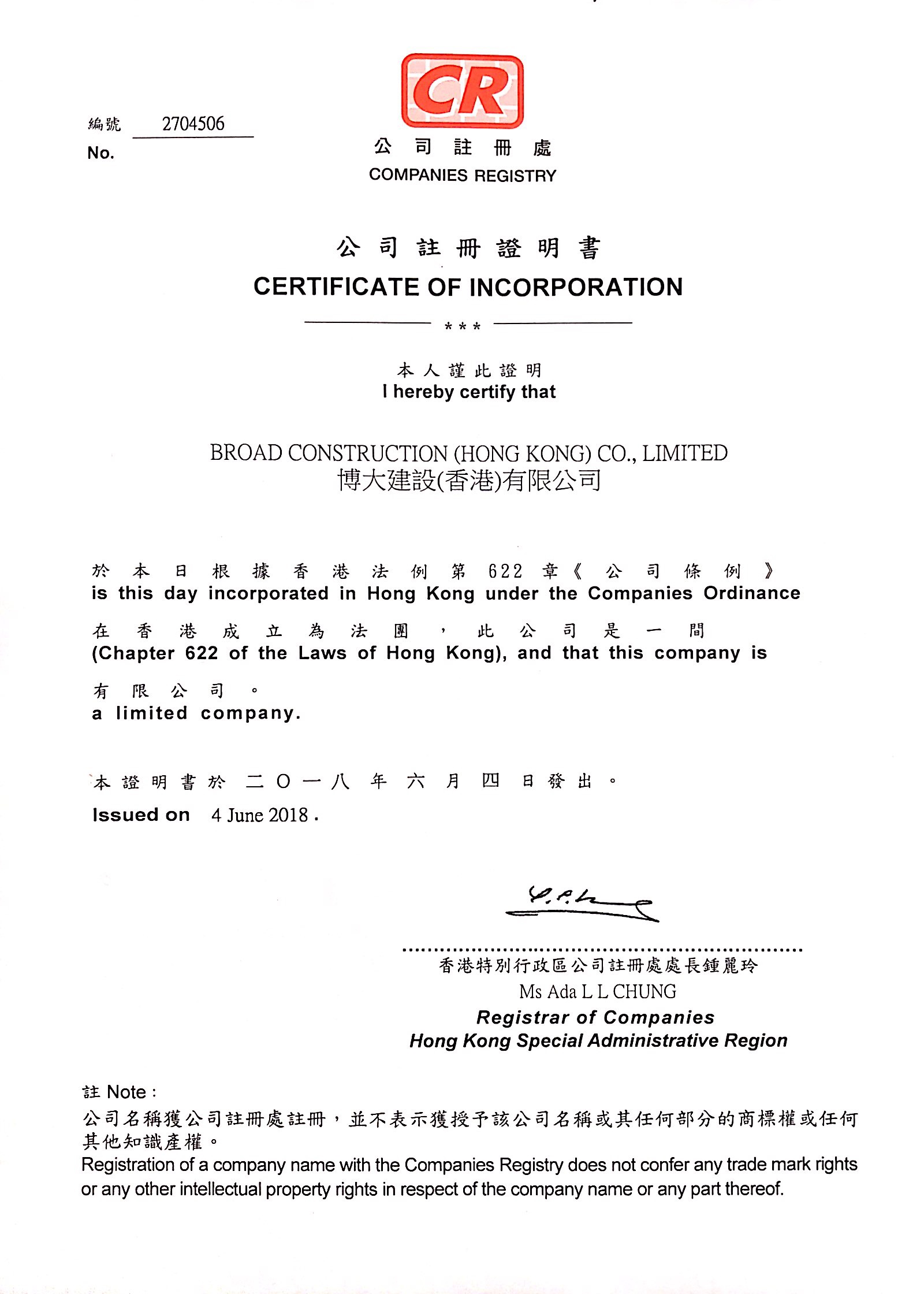博大建設(香港)有限公司注冊證書