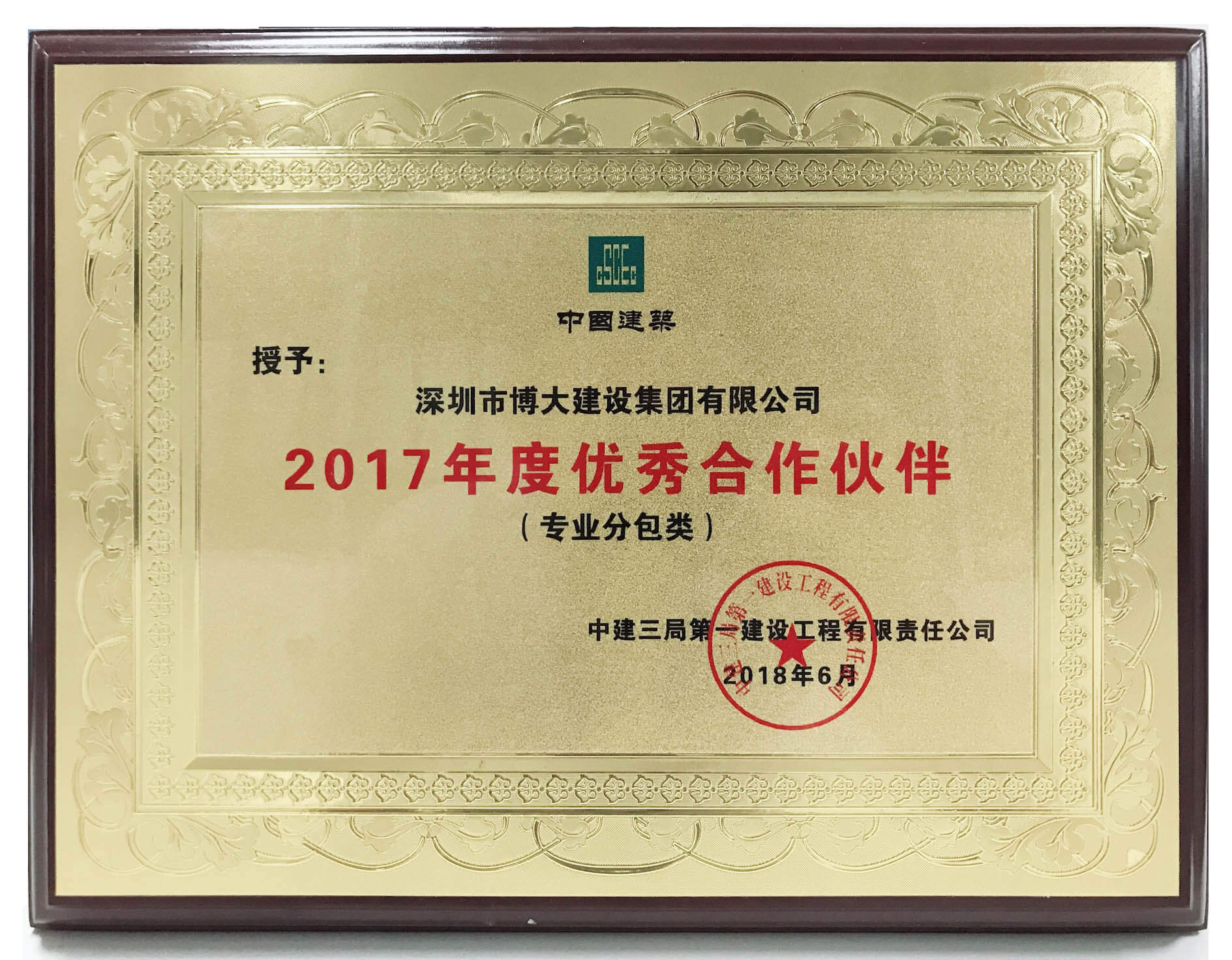 在過去的一年里,憑借“讓客戶當家作主”、“讓客戶有幸福感”的服務理念和“不畏困難敢于挑戰、保證完成任務”的鐵軍精神,博大建設集團榮獲中建三局第一建設工程有限公司頒發的“2017年度優秀合作伙伴”榮譽稱號。