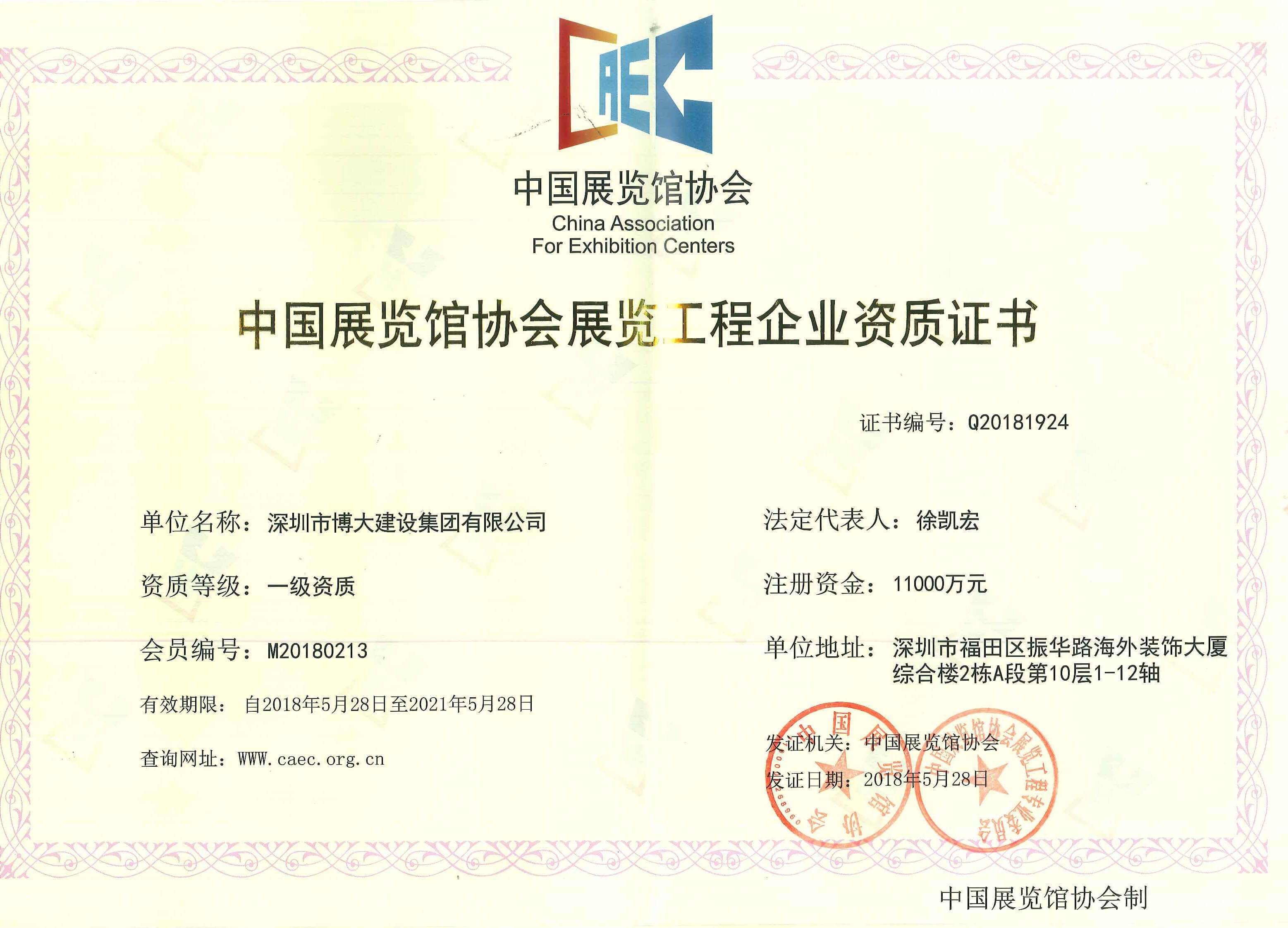 博大建設集團作為行業最具發展活力的企業,近年來以迅猛的成長速度,得到了越來越多的關注和認可。在各級領導的關懷和全體家人的共同努力下,集團資質建設取得新的進展:獲得展覽工程企業一級資質,展覽陳列工程設計與施工一體化一級資質。