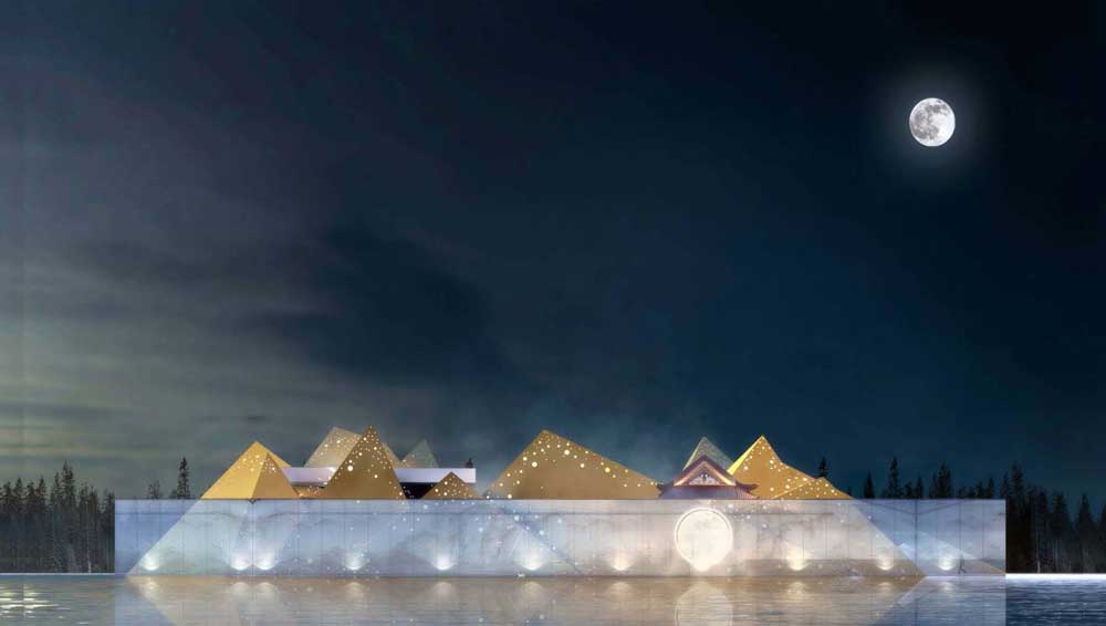 圖7為藝術(shù)展覽館。以月影為主題,形似金字塔,外墻采用古銅色鋁板密拼做法,四周外墻采用傳統(tǒng)的框架式玻璃幕墻。在月光下塔體倒映在玻璃外墻上形成像山脈一樣的山水畫,體現(xiàn)出了設(shè)計(jì)的藝術(shù)色彩。