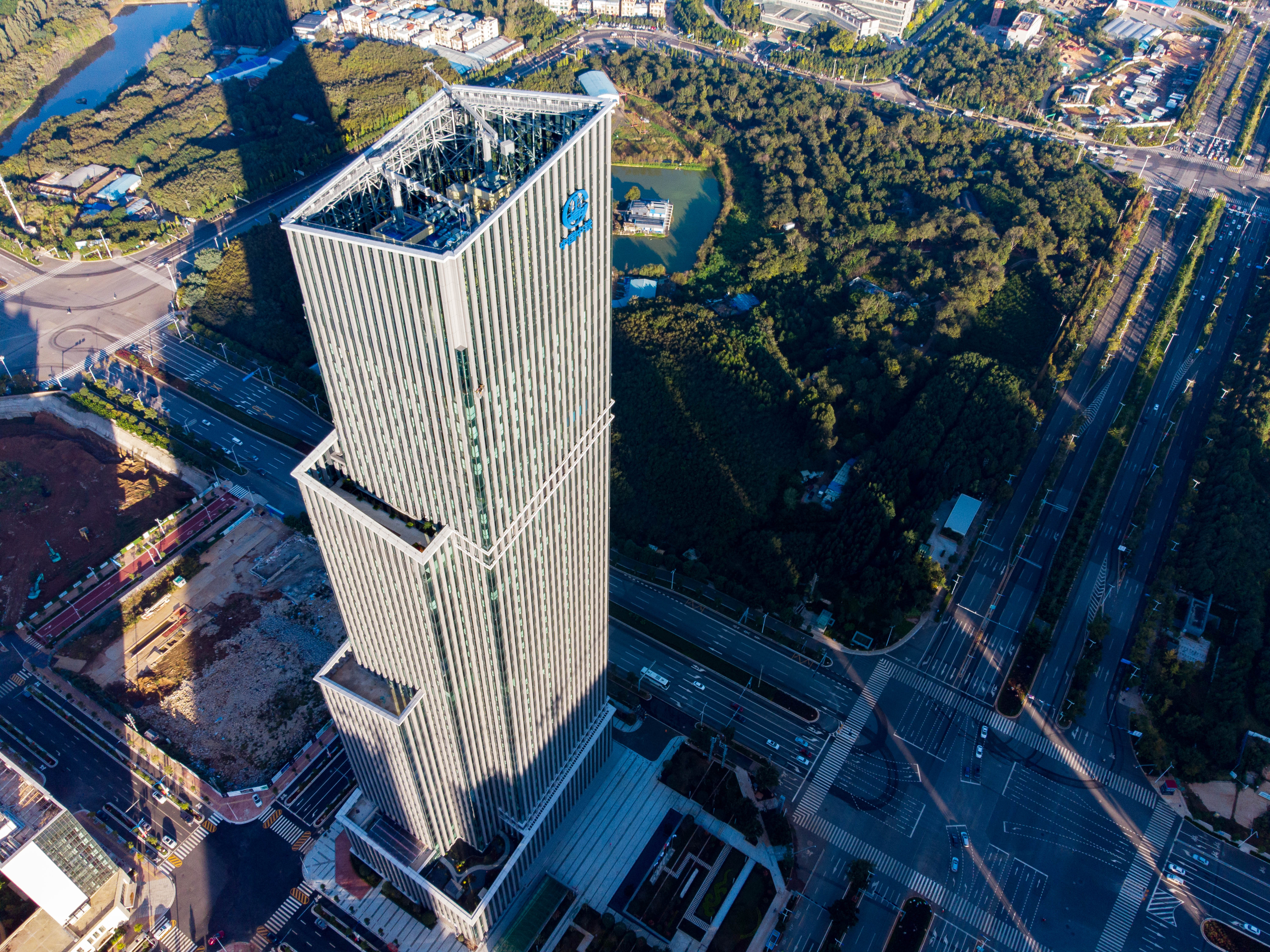 大廈通過層層升起的建筑形體形成退臺式屋頂花園,將彩云南路綠軸立體化至建筑空間,并在頂層與滇池景觀形成呼應。建筑造型取意于極具云南地方特色的“竹筍”,寓意“節節高”,展現中國中鐵股份有限公司“勇于跨越,追求卓越”的企業精神。